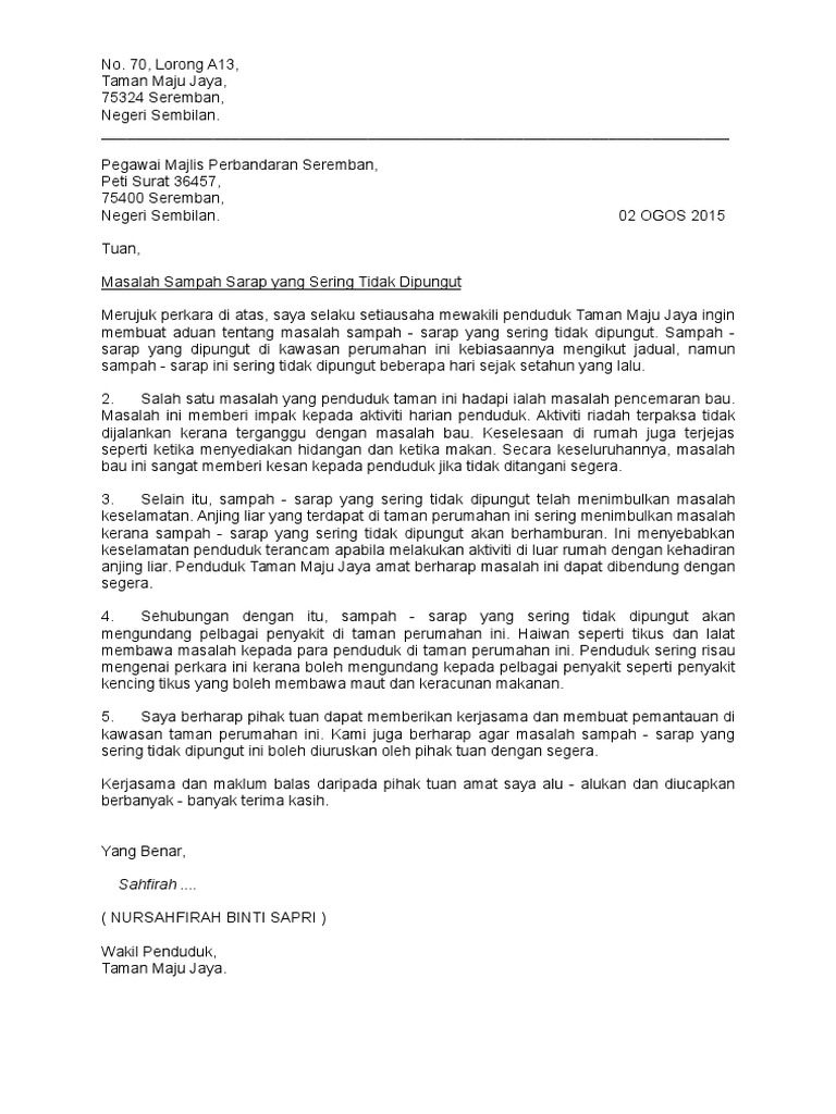 Sebagai setiausaha persatuan penduduk anda diminta untuk menulis surat kepada pihak berkuasa tempatan. Contoh Surat Aduan. Http Habinovasi Mampu Gov My Laporan Inovasi 1266 Majlis Perbandaran Kuantan Pdf.